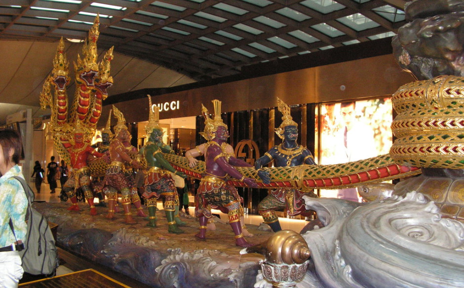 Der neue Suvarnaphumi Airport gehört zum den schönsten Flughäfen die ich kenne, das Gebäude mit der Stahlkonstruktion ist sehr beieindruckend. Im Inneren viele typisch thailändische Sachen, wie verschiedene typische Thai Häuschen, die Hanoman und Skulpuren aus der thailändischen Mytologie.