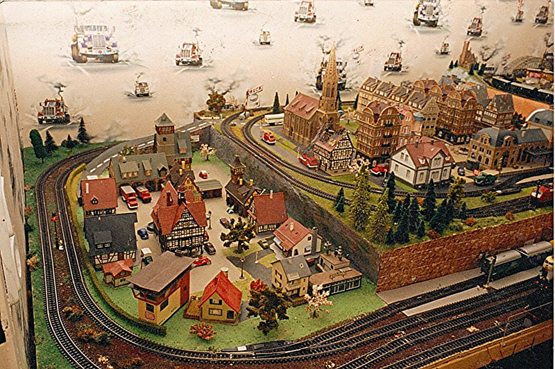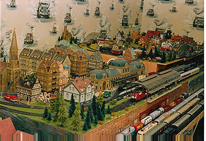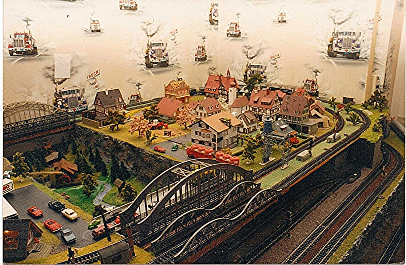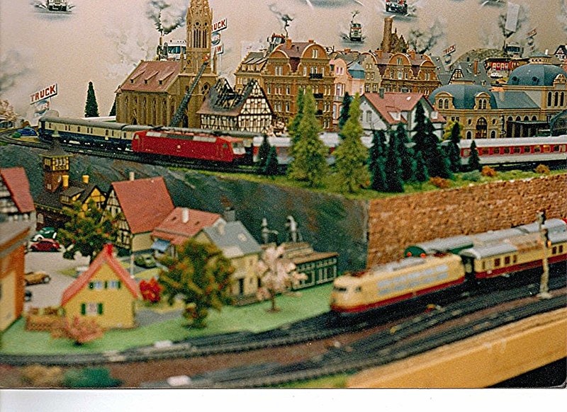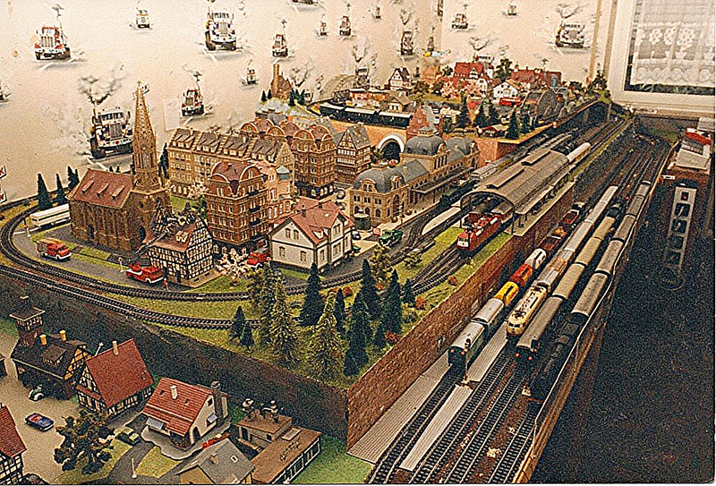 Als ich geschieden war versprach ich meinen Söhnen eine Eisenbahnanlage zu bauen. Bald hatten wir eine Wohnung zusammen. Ein halbes Jahr später stand die Eisenbahn, meine Söhne die noch keine Ahnung hatten, kamen manchmal aus dem Besuchswochenende zurück: "nur das gemacht". Dabei hatte ich mich abgemüht Signale abzustimmen, dass verschieden schnelle Lokomotiven vor dem Signal zum stehen kommen. Mit Zug war es nochmal zu überprüfen und zu ändern. Das verstanden sie alles noch nicht. Aber hier das Ergebnis, wobei ich nicht verschweigen will, dass ich heute einiges wieder anders machen würde.